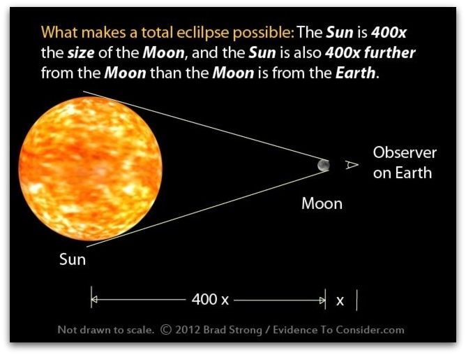 Сонцето е 400 пати поголемо од Месечината, и тоа е точно 400 пати подалеку од Земјата. Затоа, при помрачување, Сонцето и Месечината совршено се преклопуваат што е неверојатна случајност.