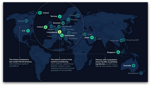 Статијата на Visual Capitalist ги подредува земјите според најновите проекции за БДП по глава на жител на Меѓународниот монетарен фонд (ММФ) за 2023 година.