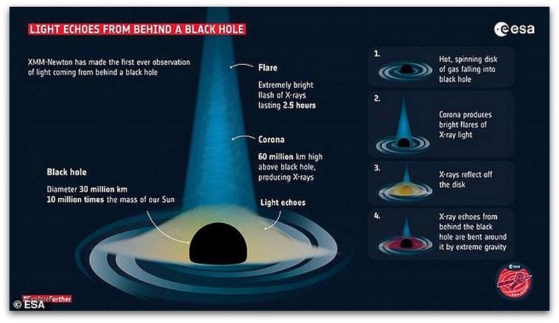 „Секоја светлина што влегува во таа црна дупка не излегува, затоа не требало ништо да се види зад црната дупка“, рече астрофизичарот Dan Wilkins од Универзитетот Стенфорд. „Причината што можеме да го видиме одразот на Х-зраците е затоа што таа црна дупка го искривува просторот, ја витка светлината и ги извртува магнетните полиња околу неа.