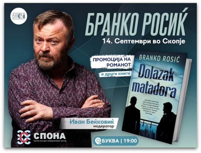 Во организација на Српскиот културно информативен центар СПОНА, на 14-ти септември (среда), во кафе-книжарницата „Буква“ (со почеток во 19 часот), белградскиот писател, новинар и музичар Бранко Росиќ ќе го промовира својот трет роман „Доаѓањето на матадорот“, објавен летово во издание на издавачката куќа „Лагуна“ од Белград.