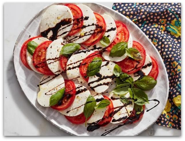 Кога сте подготвени да ја соберете салатата, исечете ги доматите на дебели парчиња. Наредете ги на послужавник наизменично со парчињата моцарела. Подвлечете ги целите лисја од босилек помеѓу парчињата домат и моцарелата.