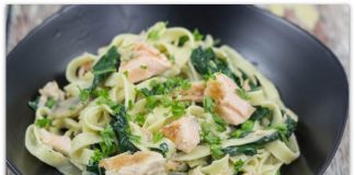 Лосос во сос од шафран со зелени тестенини