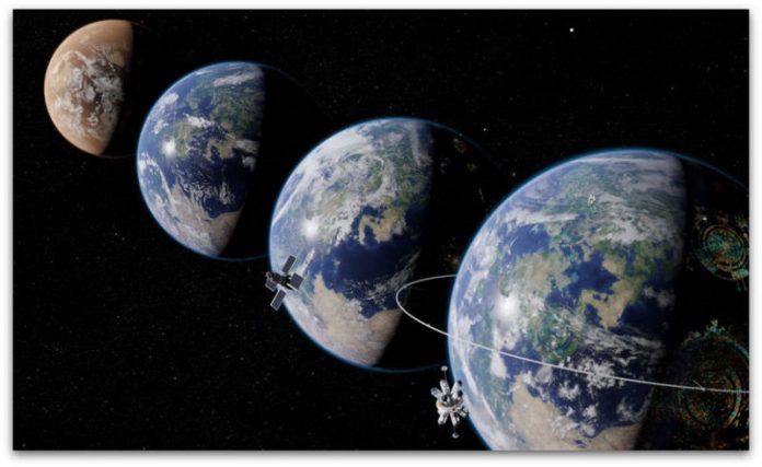 Во самонаречениот „мисловен експеримент“, астрофизичарот од University of Rochester , Adam Frank и неговите колеги David Grinspoon од Институтот за планетарна наука и Sara Walker од Државниот универзитет во Аризона, користат научна теорија и пошироки прашања за тоа како животот ја менува планетата, за да постават четири фази за да го опишат минатото и можната иднина на Земјата. (Илустрација на Универзитетот во Rochester/Michael Osadciw)