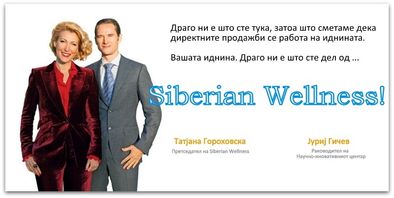 Можете да откриете фантастични потенцијални деловни насоки, можете да најдете разни начини да заработите пари. Но, без давање додека добивате, нема да ја најдете радоста што ја добиваме ние. Радост што на нашите Партнери им даваме одмор во најлуксузните хотели во светот. Радост кога нашите производи се прогласени за најдобри по состав и ефект на престижните изложби. Радост кога ќе ги видиме од солзи блескави очи и ќе слушаме илјадници благодарни гласови од луѓе на кои првин им помогнавме да станат Консултанти, а потоа да изградат сопствен профитабилен бизнис. Драго нѝ е што сте тука, бидејќи сметаме дека директната продажба е бизнис на иднината. Вашата иднина. Драго нѝ е што сте дел од Siberian Wellness!