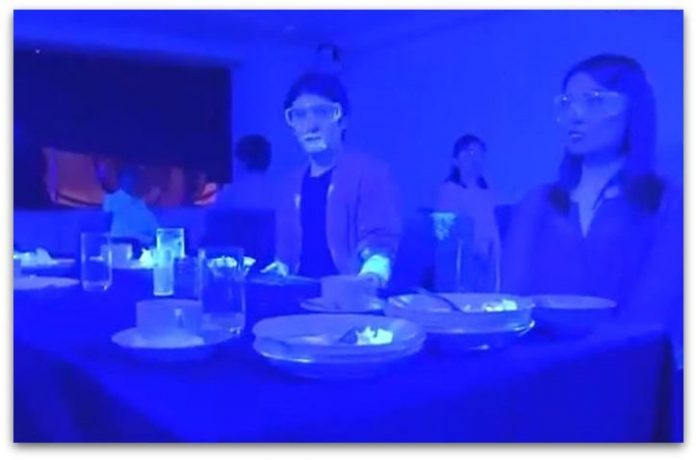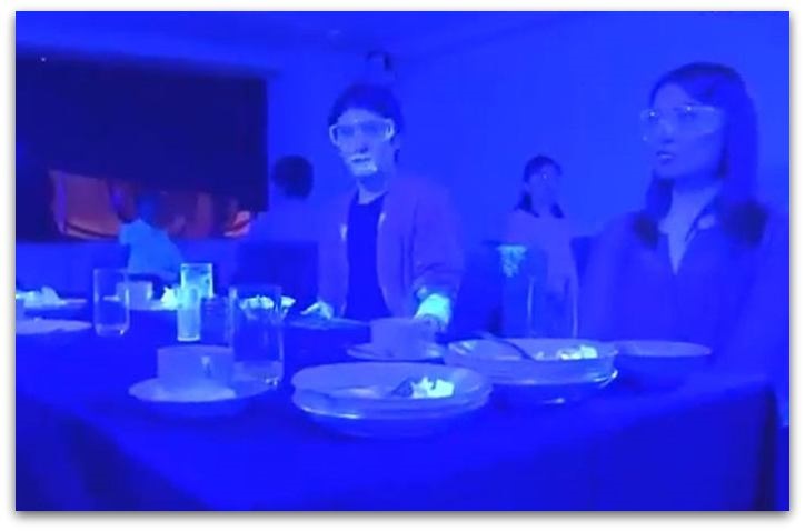 Een experiment om te zien hoe ziektekiemen zich verspreiden bij n buffet: fluorescerende verf werd op d handen v 1 persoon aangebracht &ze lieten toen een groep v 10 mensen dineren.