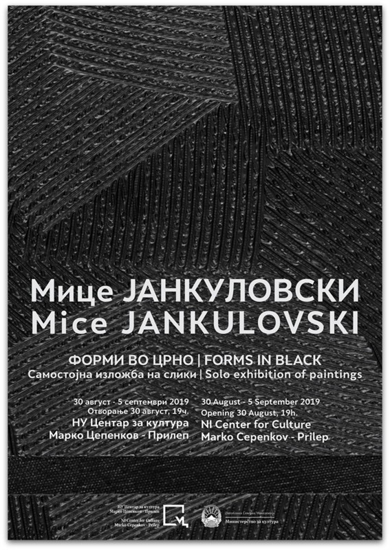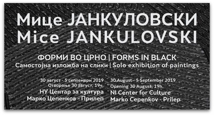 На 30 август 2019 (петок) во 19:00 ч. во Уметничката галерија на НУ Центар за култура Марко Цепенков во Прилеп ќе се отвори изложбата ”Форми во црно” на Мице Јанкуловски.