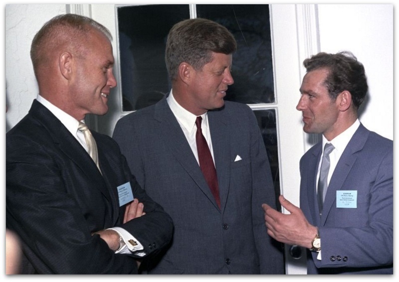 Џ.Ф. Кенеди се состана со рускиот космонаут Герман Титов и американскиот астронаут Џон Глен во Белата куќа во 1962 година.