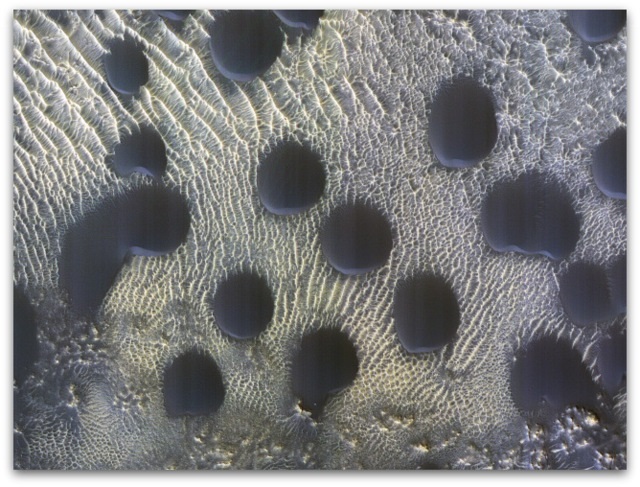 Додека некои фотографии покажуваат дини покриени со мраз, други не. Тоа што имаат наклон кон југ покажува дека дувал ветер и го носел песокот од тој правец.