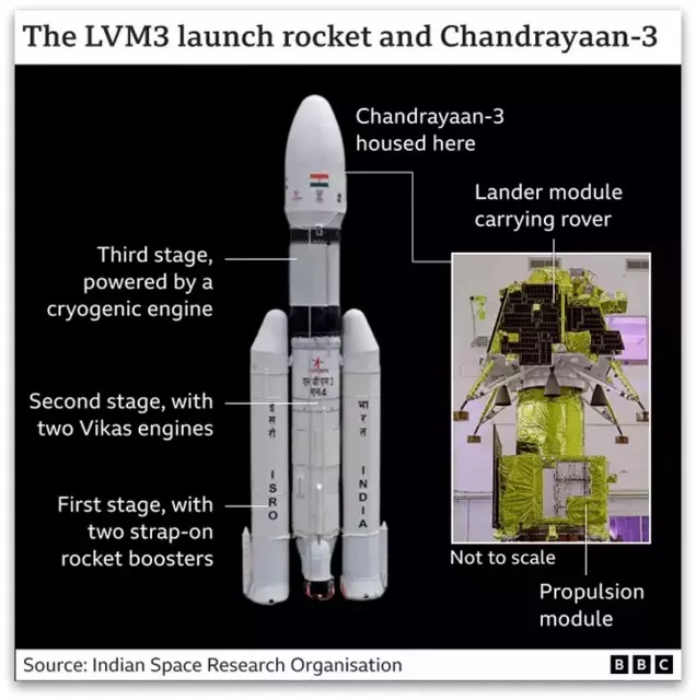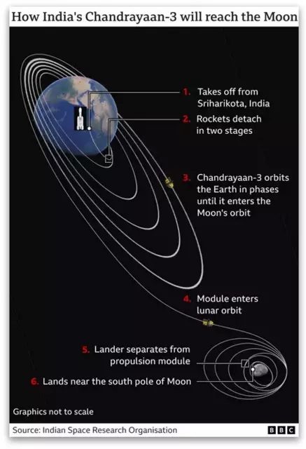 На вселенското летало Chandrayaan-3 ќе му требаат приближно 15 до 20 дена за да влезе во орбитата на Месечината. Откако ќе дојде таму, лендерот тежок 1.500 килограми ќе се спушти на површината и ќе го придвижи роверот со шест тркала тежок 26 килограми. Роверот ќе го истражува лунарниот терен, ќе собира и испраќа клучни податоци назад до контролата на летот на ISRO.