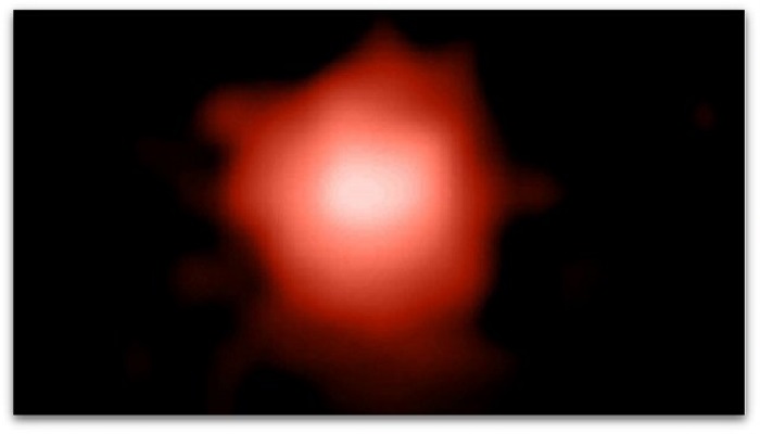 Кога ќе се „преведе“ од инфрацрвениот до видливиот спектар, галаксијата се гледа како црвена дамка со бел дел во центарот, пишува АФП.