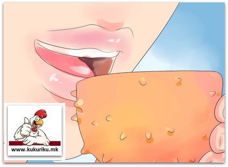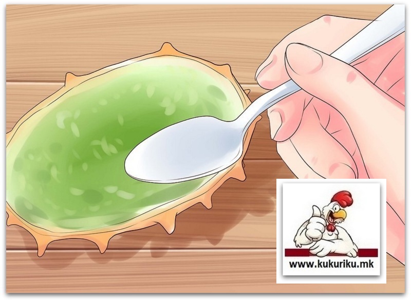 1. Ставете ја едната половина до устата и полека притискајте од крајот кон пресечениот дел. Секоја мала зелена капсула содржи семка слична на семката од краставицата која лесно излегува при мал притисок.