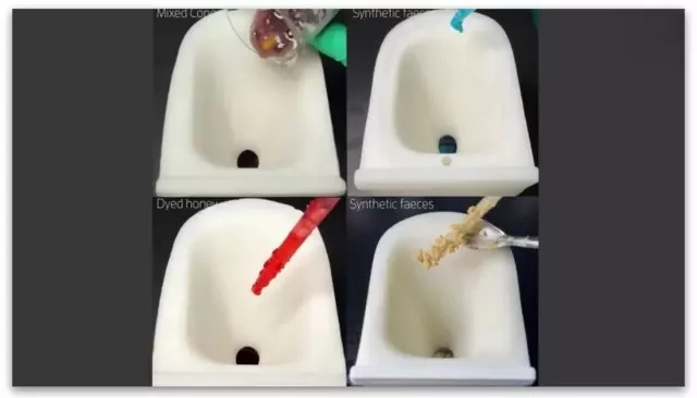 Различни супстанции, вклучително заматена вода, млеко, јогурт, мед, гел од скроб и синтетички измет, биле ригорозно воведени за да се испита површината на тоалетната школка.