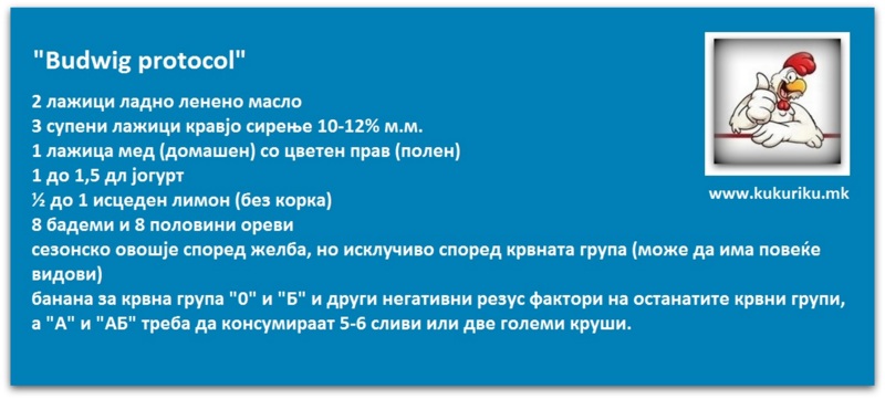 Она што е речиси подеднакво за сите видови крвни групи е здрав појадок, кој секој може да го консумира без никакви ограничувања (без оглед на пол, старост, болест, хемотерапија, земање на одредени лекови). Се препорачува појадок кој според авторката, научникот Johanna Budwig, е наречен “протокол Budwig”, во кој таа според крвните групи го корегирала само овошјето. По таков појадок, крвта ќе ви се наполни со кислород и ќе стане посветла, на жените ќе се стабилизира циклусот, а по 4, 5 месеци ќе им доаѓа во рок од 48 часа. Тоа ќе ја поправи перисталтиката на цревата, ќе дишат полесно и ќе им го врати чувството на сила. Можно е да се јави почетно кратко и благо гадење, а по 2 до 3 дена енергично празнење на цревата.