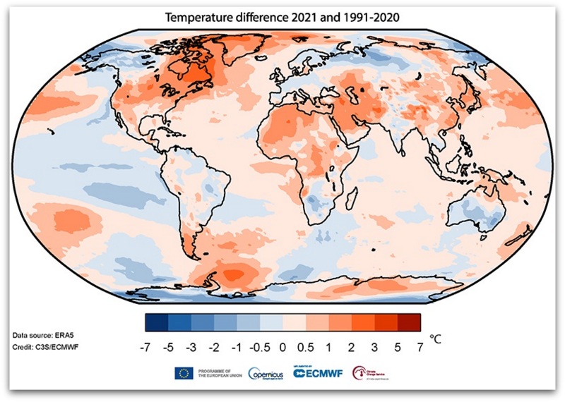 На глобално ниво, извештајот покажа дека 2021 година била меѓу седум и пет од најтопли години забележани досега, во зависност од податоците кои се користени.