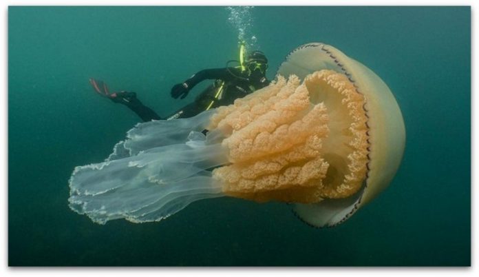 Медуза со големина на човек е забележана и снимена во приморјето кај градот Корнвол, Велика Британија, објави „Гардијан“.