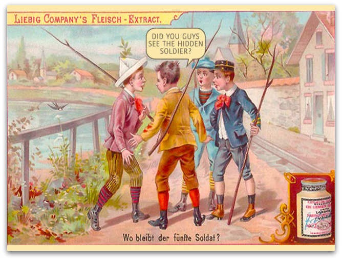 Во една од нив, задачата е да се најде скриен војник во цртежот на четири момчиња, што на многумина им изгледа невозможно по некое време на набудување.