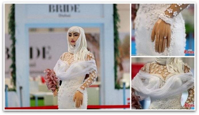 Уникатната торта беше претставена на специјална изложба во Дубаи. По фустанот на жената од арапско потекло има пет дијаманти, секој со вредност од по по 200 илјади. Долари.