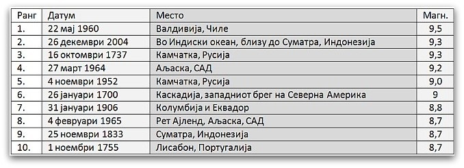 Покрај прегледот на најсмртоносните земјотреси, значајно е да се види и кои биле најсилните земјотреси во човековата историја. Не секогаш најсилните се и најсмртоносни земјотреси и обратно. Тоа најмногу зависи дали погодениот регион има густа или ретка населеност, какви се градбите, во кој период бил земјотресот и сл. Интересно е што повеќе извонредно силни земјотреси се случиле токму во последните стотина години, што јасно се гледа во долната табела.