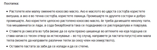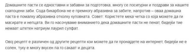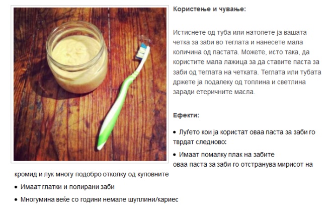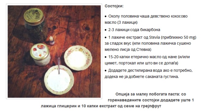 Веќе сите знаат дека повеќето комерцијални пасти за заби содржат многу токсични состојки: натриум флуорид, натриум лаурил сулфат, триклосан, вештачки бои и ароми, пропилен гликол, и.сл.