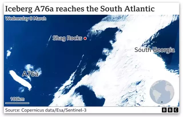 Замрзнатата плоча А76а се одвоила од ледената покривка Filchner-Ronne во мај 2021 година, но сега, носена од струи и ветрови, патува на север кон Фокландите. Научниците се загрижени дека може да се доближи до брегот и да се заглави во плитки води. Ова може да доведе до распаѓање на помали ледени брегови што би го загрозило движењето на бродовите во областа.