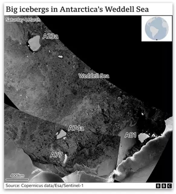 Британските научници внимателно следат две откинати “парчиња” мраз, за кои се смета дека се меѓу најголемите во светот. Имено, откако се разделија од Антарктикот, тие се на радарот на научниците бидејќи поради големината и траекторијата може да го попречат поморскиот сообраќај, но и да влијаат на миграцијата на дивите животни.