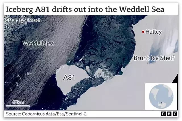 Другата ледена плоча, А81, се одвоила од ледената покривка Brunt на крајот на јануари. Научниците очекувале да се одвои уште порано, а сега проценуваат дека, носена од морските струи, би можела да го следи истиот пат како и А76а.