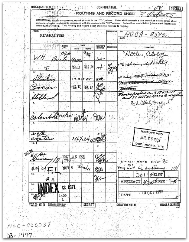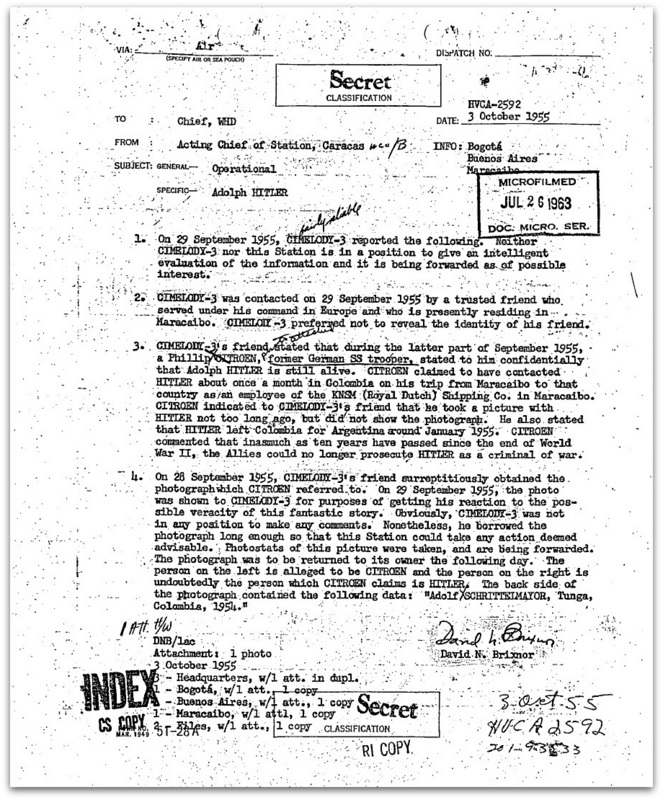Всушност, документот кој го потпишал шефот на канцеларијата на ЦИА во Каракас, Венецуела, David Brixnor, бил испратен во Вашингтон во 1955 година, заедно со фотографијата која наводно го покажува Хитлер со “многу сигурен” извор на ЦИА Citroen. Во документот пишува дека фотографијата била сликана “не толку одамна”.