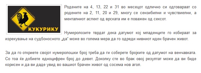 ХОРОСКОП НУМЕРОЛОГИЈА | Моќта на брачниот број – Откријте што може да ви донесе вистинскиот датум January 16, 2019 1984 Share Facebook Twitter Google+ Pinterest WhatsApp Каде е патот до среќата: Датумот на изрекувањето на судбоносното „да“ може да го одреди текот на брачниот живот и да влијае на иднината на брачниот пар, тврдат нумеролозите.