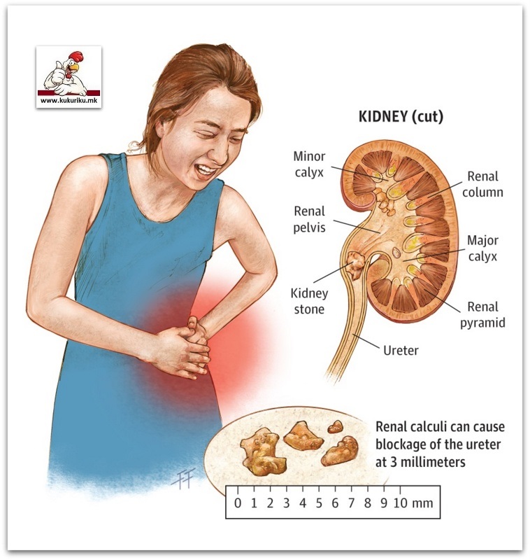 Камењата на бубрезите предизвикуваат силна болка во долниот дел на грбот и колкот, а подоцна почнува да се шири. Понекогаш се придружени со гадење, повраќање и крв во урината, а поради неподносливата болка, пациентите често итно им се обраќаат на лекарите.