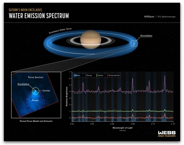 Оваа месечина, шестата по големина што орбитира околу Сатурн, е оддалечена повеќе од 230.000 километри од неа, постојано исфрлајќи молекули на вода, оставајќи зад себе, како што сликовито опишана од NASA, ореол, речиси како крофна. Според податоците на Webb, Enceladus го снабдува со вода целиот систем на Сатурн, вклучувајќи ја и самата планета.