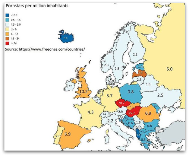 Според таа статистика, Унгарија е убедливо прва во Европа со 75,7 актерки од филмови за возрасни на милион жители, а Чешка е на второ место со 70,7.