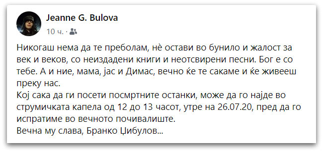 Посмртните останки ќе бидат изложени во струмичката капела утре на 26.07.20 од 12 до 13 часот.