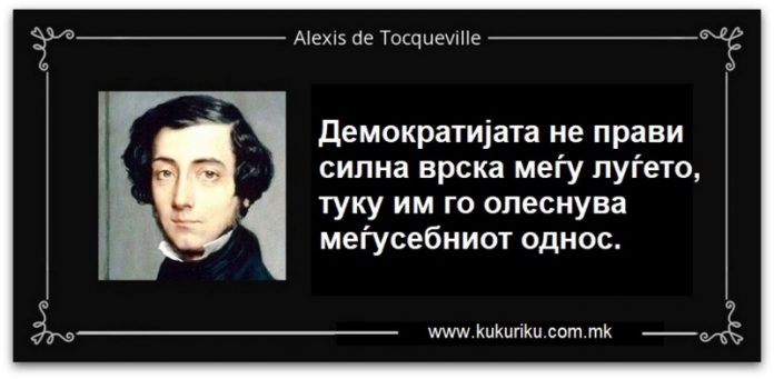 МИСЛИТЕЛИ Позитивна мисла | Alexis de Tocqueville – Демократија November 15, 2021 1568 Share Facebook Twitter Google+ Pinterest WhatsApp Демократијата не прави силна врска меѓу луѓето, туку им го олеснува меѓусебниот однос. Alexis de Tocqueville