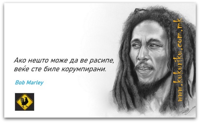 ЖИВОТИНФО 369МИСЛИТЕЛИ Позитивна мисла | Bob Marley June 3, 2024 820 Share Facebook Twitter Google+ Pinterest WhatsApp Ако нешто може да ве расипе, веќе сте биле корумпирани. Bob Marley