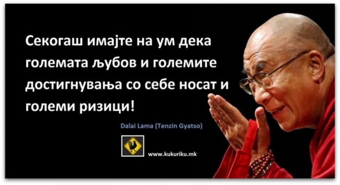 МИСЛИТЕЛИ Позитивна мисла | Dalai Lama April 12, 2019 1879 Share Facebook Twitter Google+ Pinterest WhatsApp Секогаш имајте на ум дека големата љубов и големите достигнувања со себе носат и големи ризици! Dalai Lama