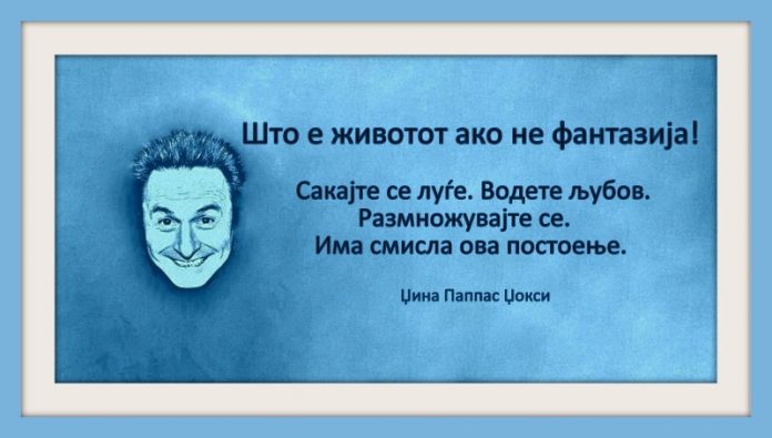МИСЛИТЕЛИ Позитивна мисла | Џина Паппас Џокси September 7, 2019 1825 Share Facebook Twitter Google+ Pinterest WhatsApp Што е животот ако не фантазија! Сакајте се луѓе. Водете љубов. Размножувајте се. Има смисла ова постоење. Џина Паппас Џокси