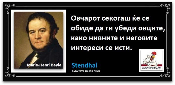 МИСЛИТЕЛИ Позитивна мисла | Stendhal February 6, 2019 2011 Share Facebook Twitter Google+ Pinterest WhatsApp Овчарот секогаш ќе се обиде да ги убеди оците, како нивните и неговите интереси се исти. Stendhal
