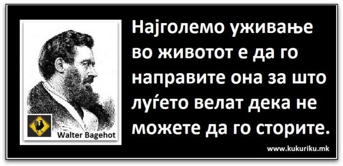 МИСЛИТЕЛИ Позитивна мисла | Walter Bagehot April 16, 2016 2026 Share Facebook Twitter Google+ Pinterest WhatsApp Најголемо уживање во животот е да го направите она за што луѓето велат дека не можете да го сторите. Walter Bagehot