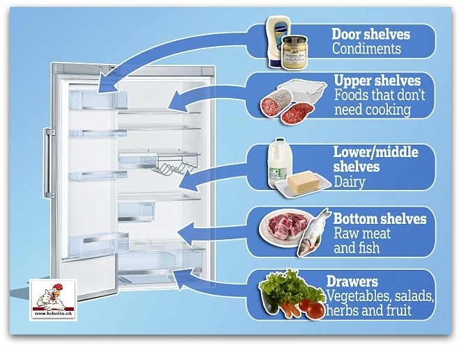 Кога зборуваме за распоредот на намирниците во ладилникот, во задниот дел ставете ги намирниците кои не ги користите многу често и кои имаат подолг век на траење, а напред нека бидат оние намирници кои секојдневно ги употребувате, и оние кои имаат пократок рок на траење.