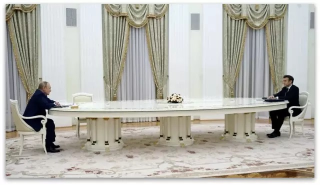 Владимир Путин и Емануел Макрон на невообичаено долгата маса за состаноци на Путин