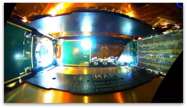 Внатрешноста на вселенската Microwave Array for Power-transfer Low-orbit Experiment (MAPLE) која емитира собрана енергија низ празниот простор користејќи низа предаватели (десно) до два приема (десно) за да осветли LED.