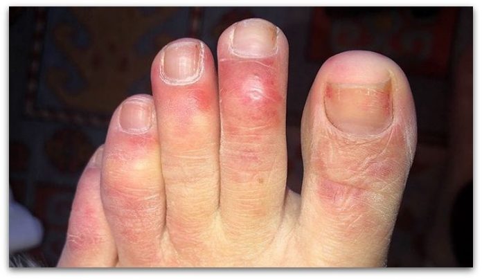 Во рамките на болеста, се јавува воспалителна промена со црвенило на рацете и нозете, состојба која понекогаш трае со месеци – наречена е “ковид прсти”.