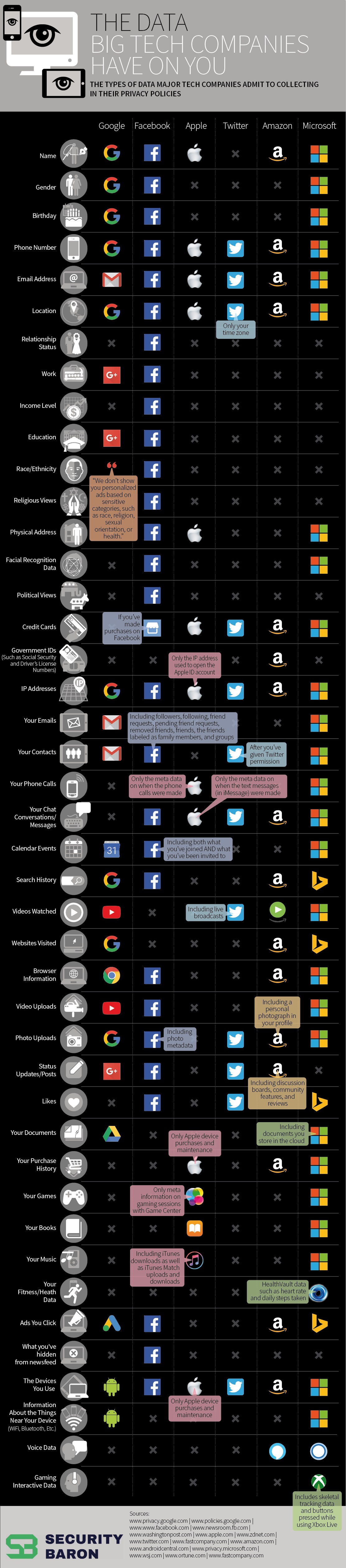 Компанијата Security Baron ги проучуваше правилата за користење и заштита на податоци на Facebook, Google, Apple, Twitter, Amazon и Microsoft и потоа состави инфографик кој покажува кои сѐ лични податоци овие комапнии признаваат дека ги земаат од корисниците.