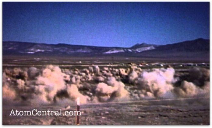Видеото ги покажува нагледните последици од подземна нуклеарна експлозија кога земјата во неговиот епицентар се претвора во огромен кратер.