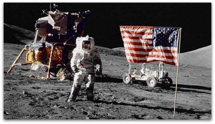 Авторот ги наведува во статијата резултатите од минатогодишната испитувања на јавното мислење според кои 57 отсто од Русите не веруваат дека слетувањето на Месечината всушност и се случило.