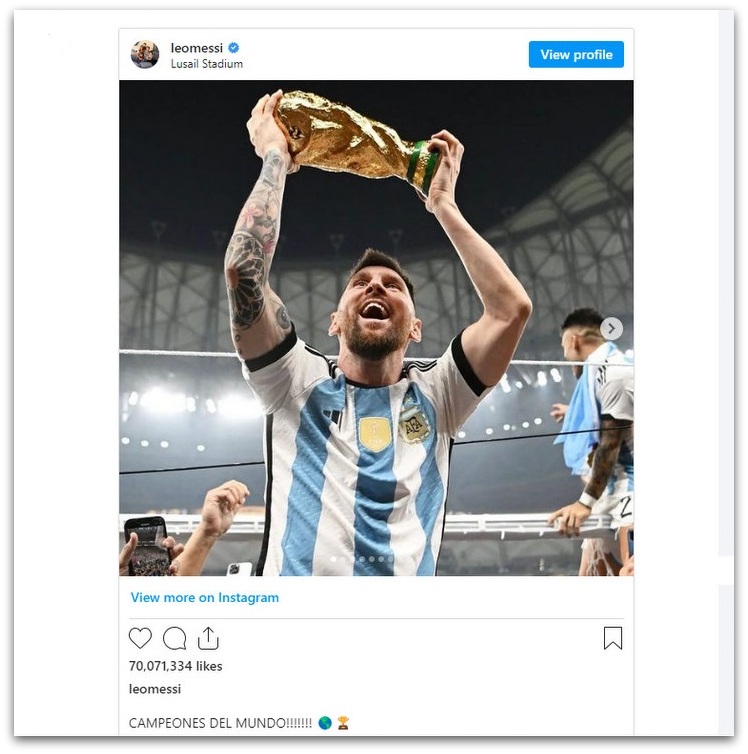 Со оваа објава Меси го сруши рекордот на Instagram бидејќи собрал најмногу лајкови досега (повеќе од 70 милиони), а јасно е дека оваа бројка ќе продолжи да расте. Покрај оваа објава, голем број лајкови собра и објавата на Меси во која тој спие во кревет гушкајќи го трофејот, а повеќе од 49 милиони луѓе му дадоа палци.