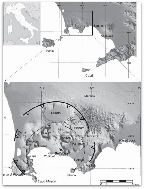 Карта на локација на Campi Flegrei во неаполската област и мапа на Campi Flegrei која ја покажува границата на двете калдери. Најновите вулкани, по Neapolitan Yellow Tuff, сите се наоѓаат по работ на најмладиот, околу заливот на Pozzuoli
