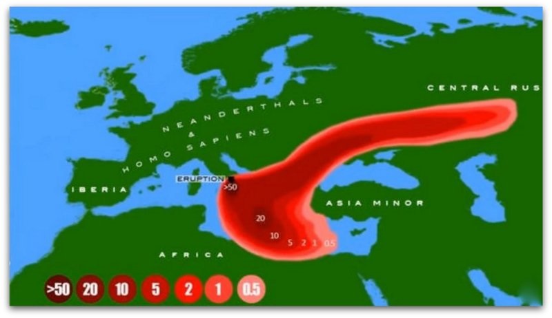 Од Италија преку нашите краишта и Источна Европа тогаш паднало околу 20 сm вулканска пепел, а на Русија 5cm. При тоа сулфурниот отпад предизвикал вулканска зима и тогаш Светот се изладил за 4 степени на подолг период. Истото тоа заладување среде леденото доба довело до истребување на неандреталците во Европа.