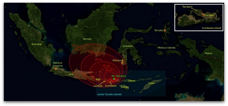 Mount Tambora, Indonesia – Проценетите региони на вулканска пeпел за време на ерупцијата во 1815 година. Црвените области ја покажуваат дебелината на вулканската пепел. Најоддалечениот регион (дебелина од 1 см) достигна на Борнео и Сулавеси.