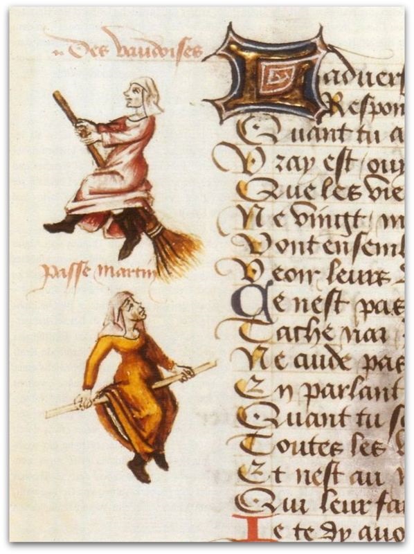 Најраната позната слика на вештерки на метли датира од 1451 година, кога се појавија две илустрации во ракописот на францускиот поет Мартин Ле Франк, „Бранителот на дамите“. На два цртежи, една жена лета низ воздухот на метла, другата лета на обичен бел стап. И двете носат марами и се идентификувани како жени од Валдез, припадници на христијанска секта основана во 12 век, а католичката црква ги означуваше како еретици, делумно затоа што им дозволуваше на жените да станат свештеници.
